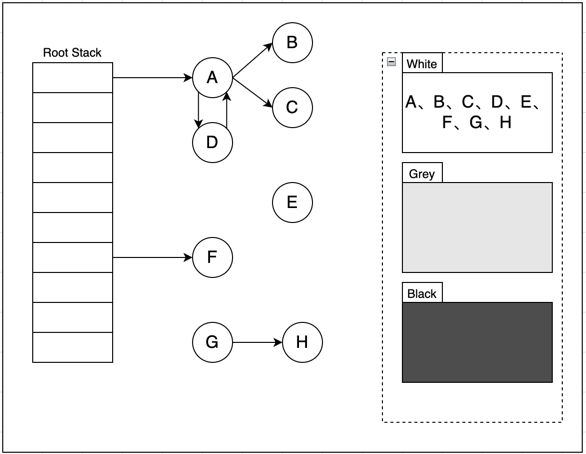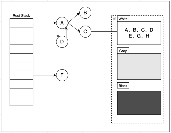 GC 会循环遍历灰色对象,直到灰色对象之中没有节点结束。B、C、D没有子节点,会变为黑色对象,即循环遍历所有节点,将所有父节点置黑。