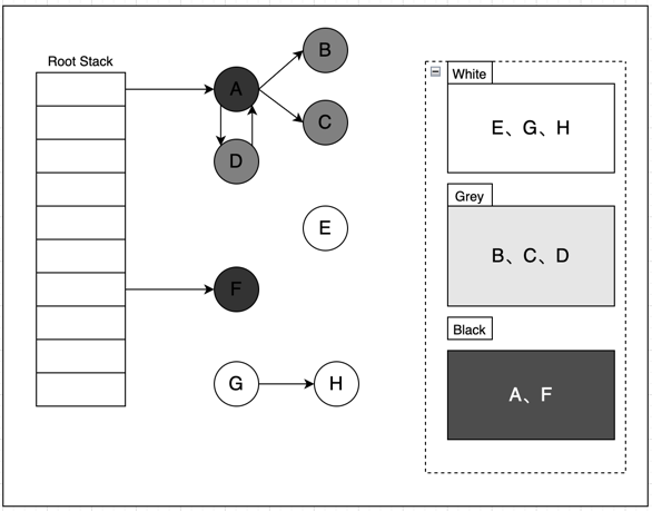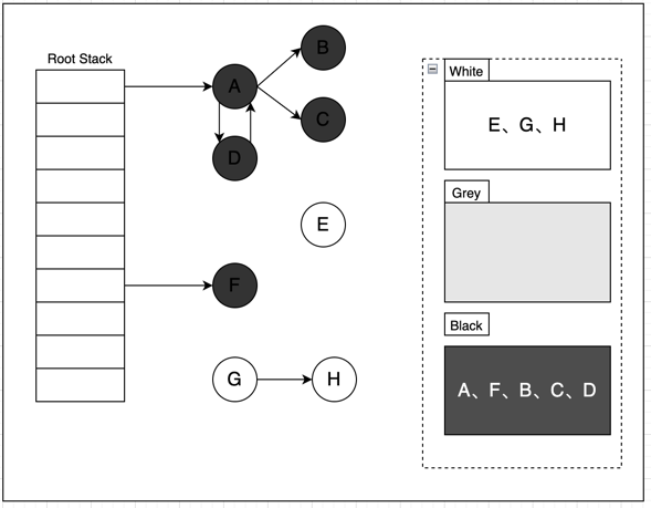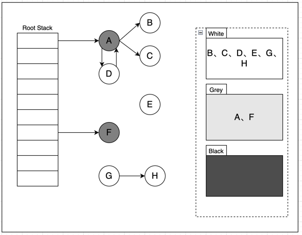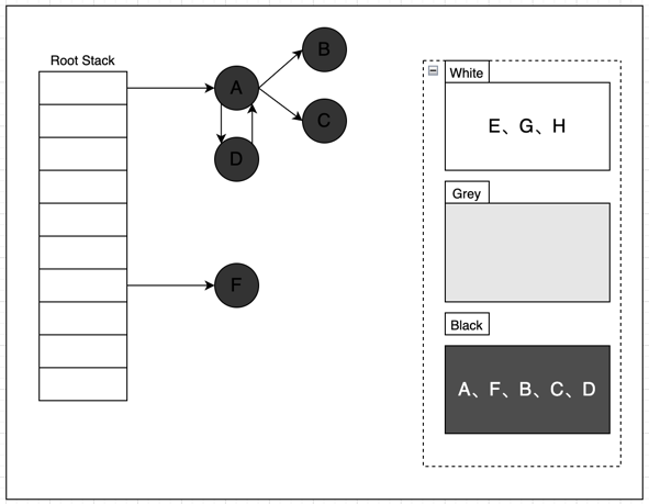 GC 继续扫描灰色对象,将根节点的子节点标记为灰色对象。A 的子节点 B C D 被标记为灰色对象,A 被标记为黑色对象。F 没有子节点,也被标记为黑色对象,即根节点置黑,子节点置灰