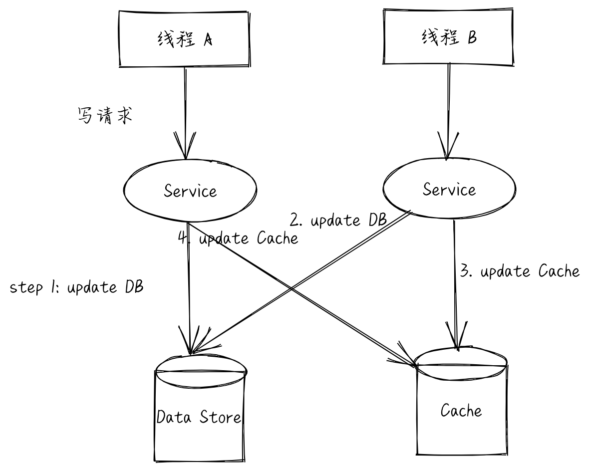 如果遇到多线程情况,也会有类似情况,出现缓存中存储的是脏数据。因此 Cache-Aside 缓存模式,选择了先操作数据库而不是先操作缓存